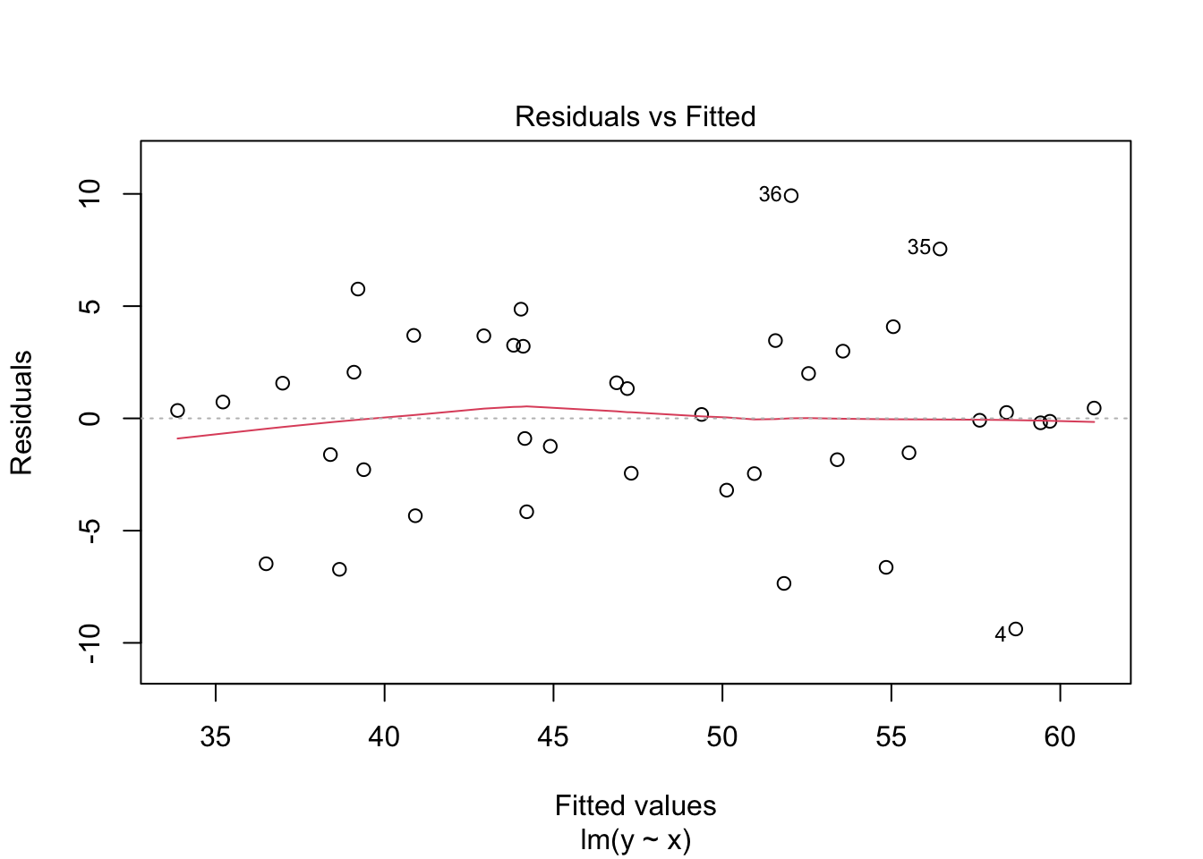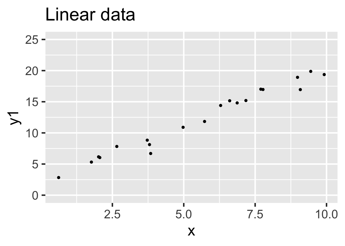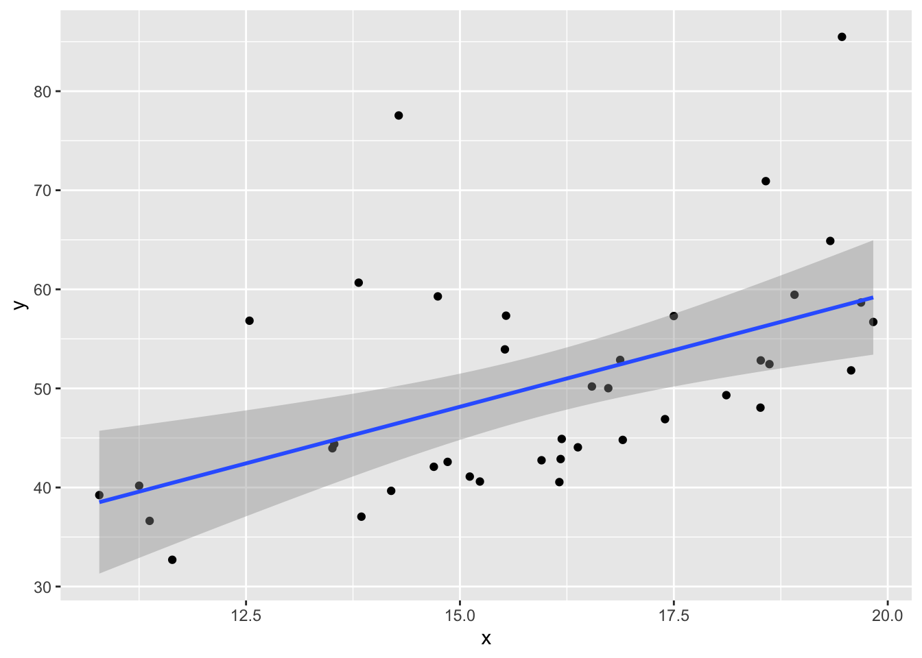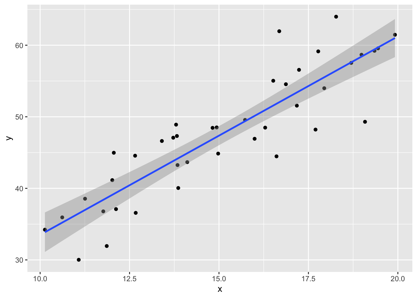 - The mean value of \(x\) is 10. Model \(y\) on \(x\) and compute the residual when \(x = 10\). Replicate this and verify that the standard deviation of the residuals when \(x = 10\) is about 2.9.