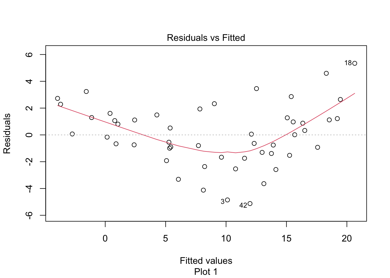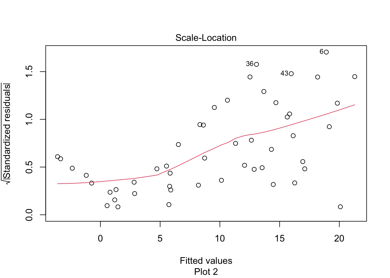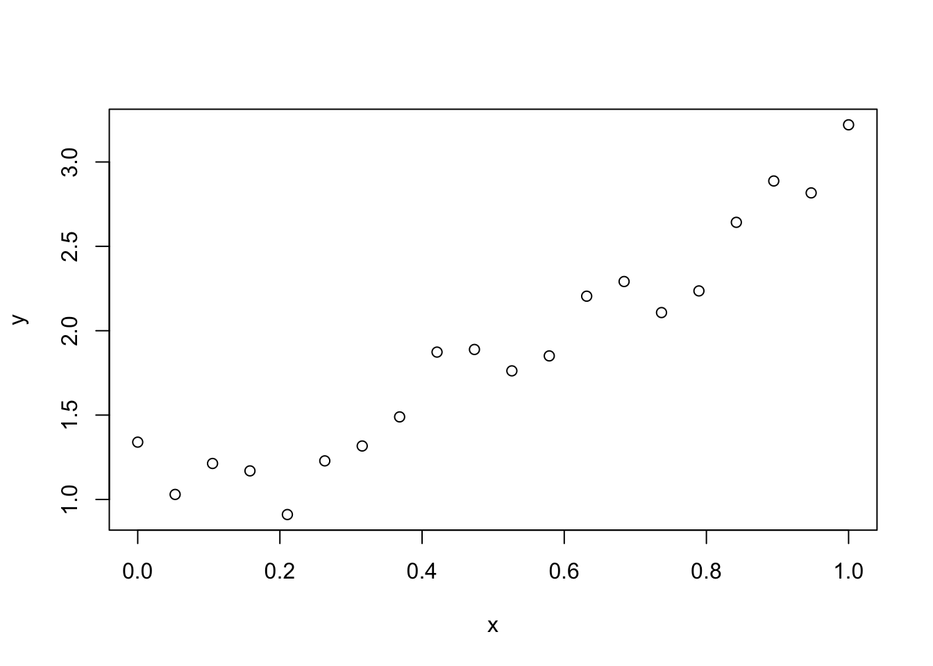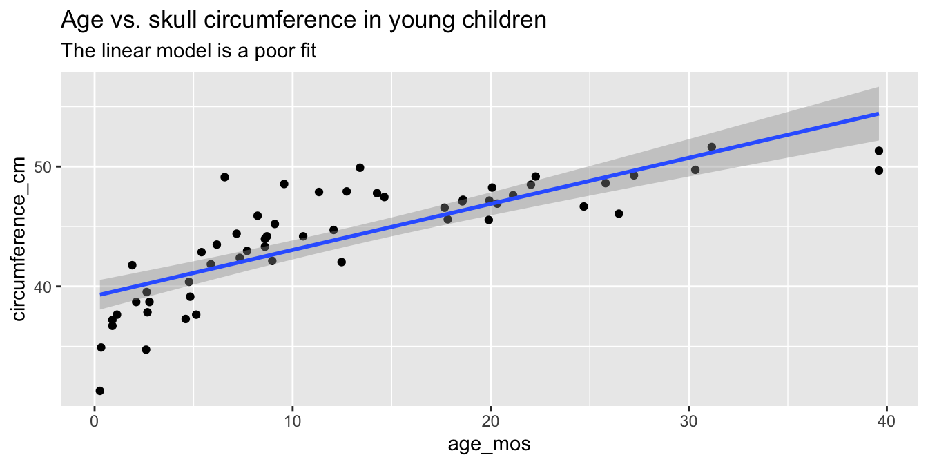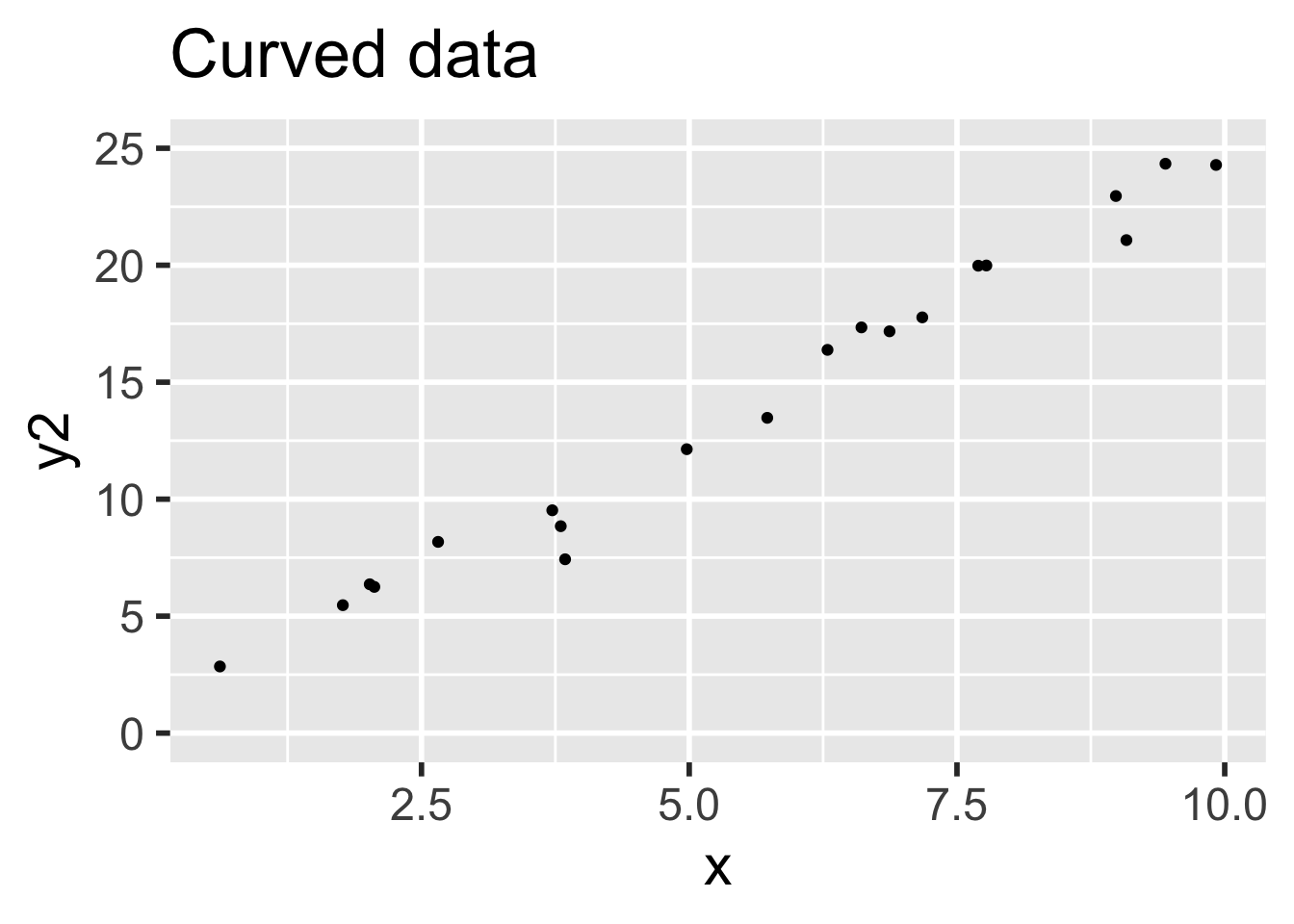 Rather than a linear relationship, an inverse relationship of the form \(\hat{y} = \beta_0 + \frac{\beta_1}{x}\) may be a better model for this data.