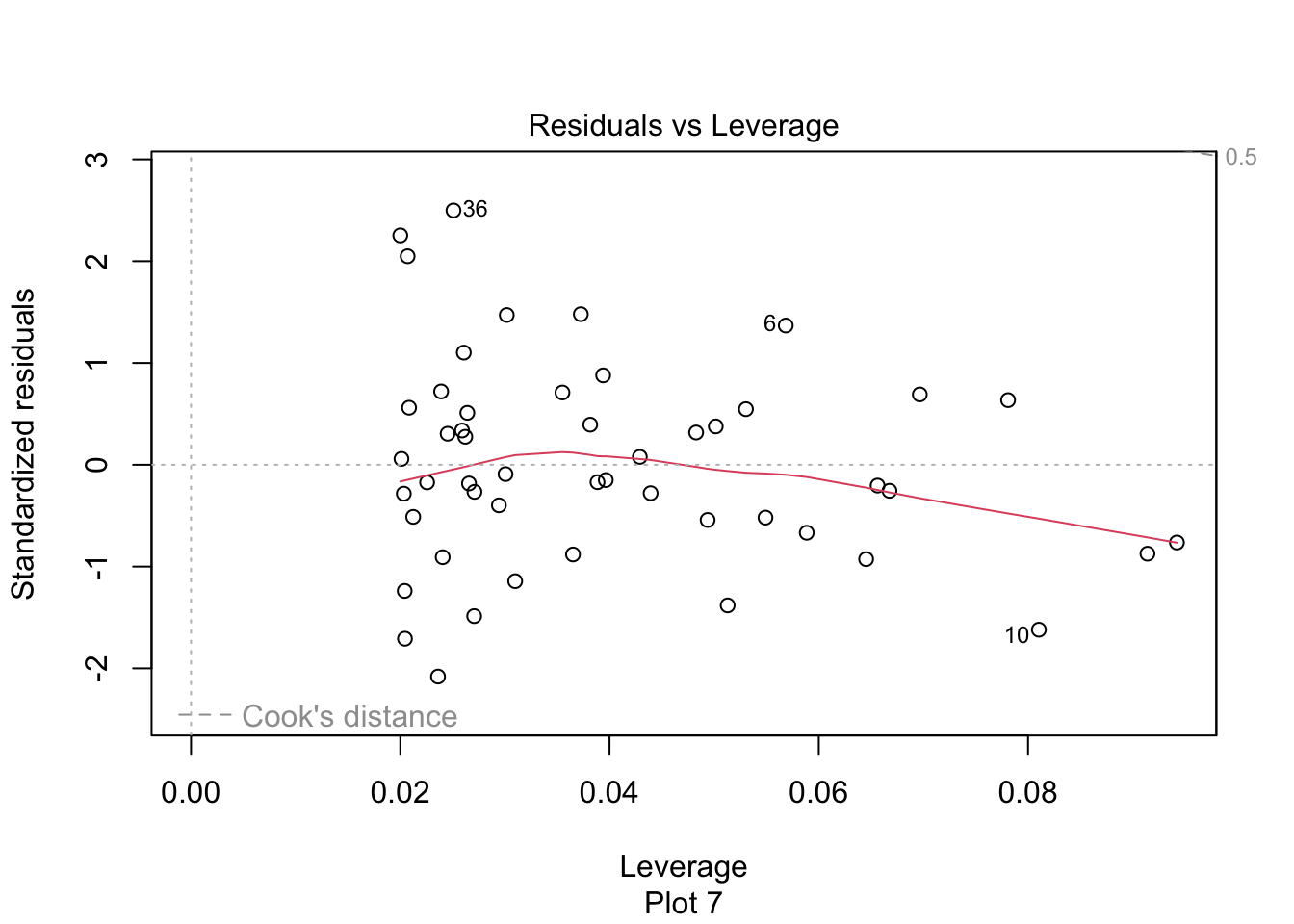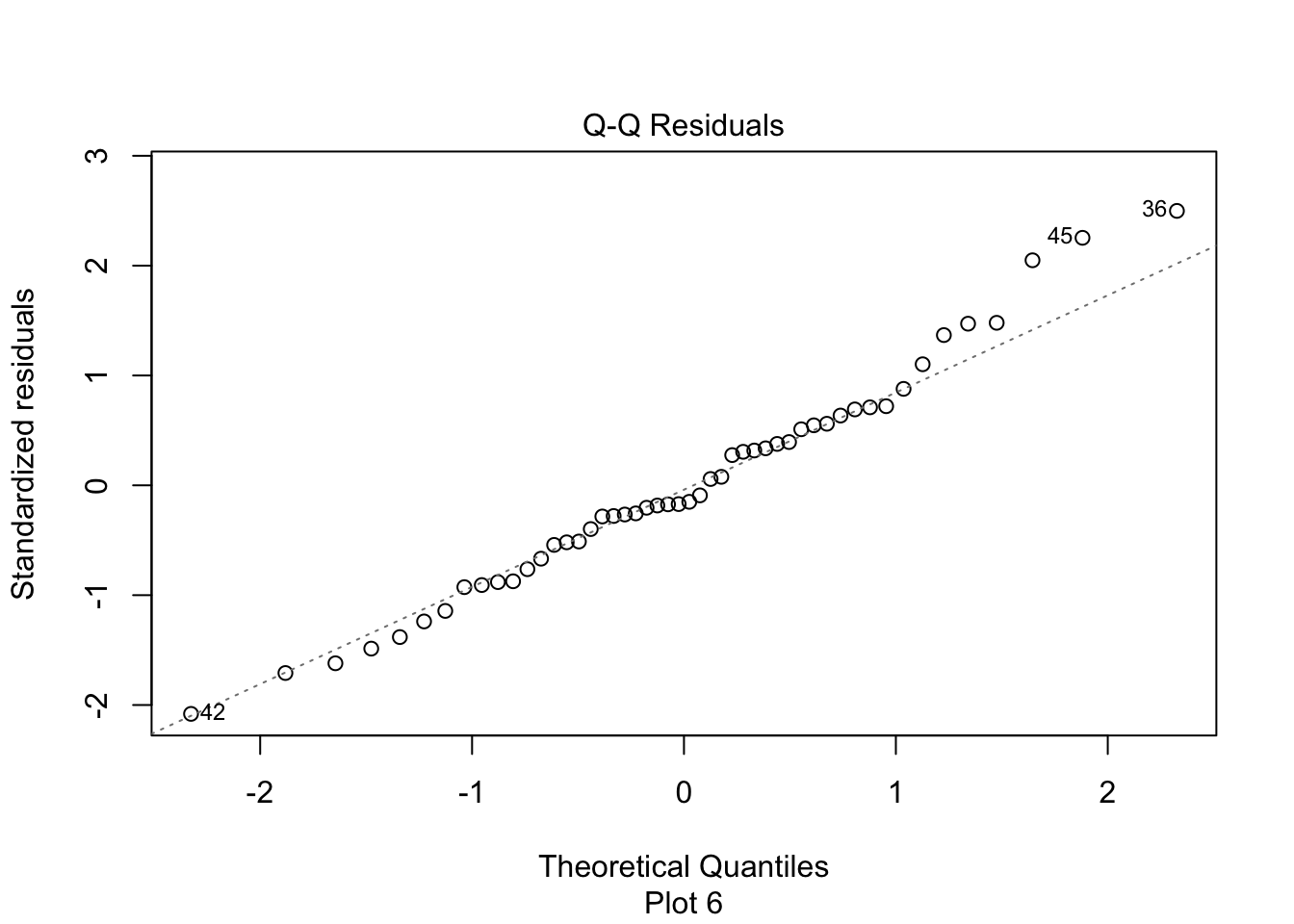 Observe that the first and sixth residuals are negative, since the data points at \(x_1 = 0.1\) and \(x_6 = 0.9\) are both below the regression line. The other residuals are positive since those data points lie above the line.