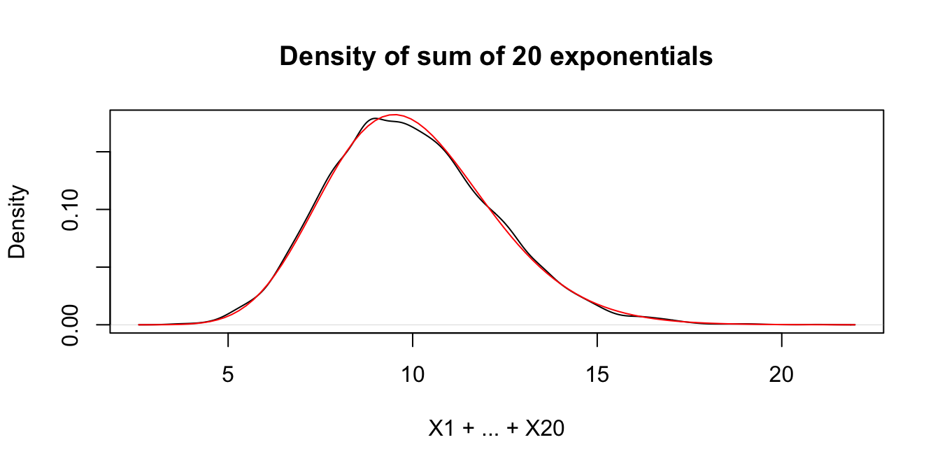 - Plot the density for the sum of exponentials and add the pdf of \(\text{Normal}(\mu,\sigma)\) to your plot. How well does it seem to fit?
