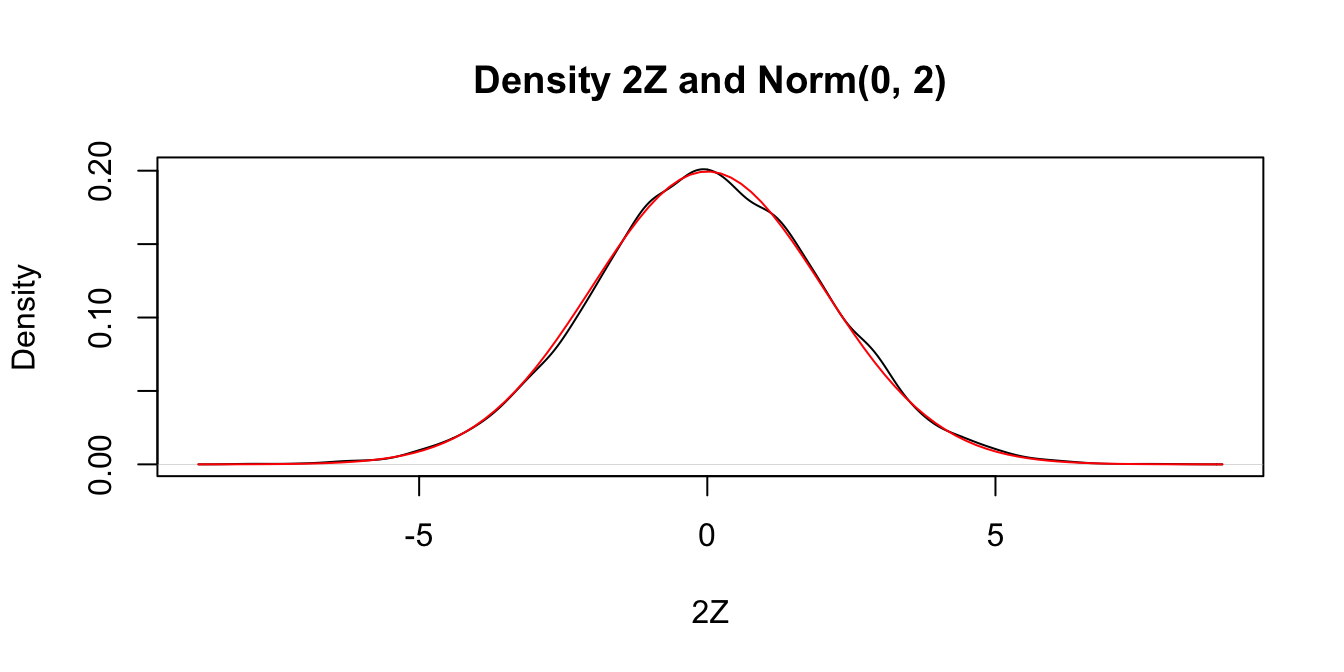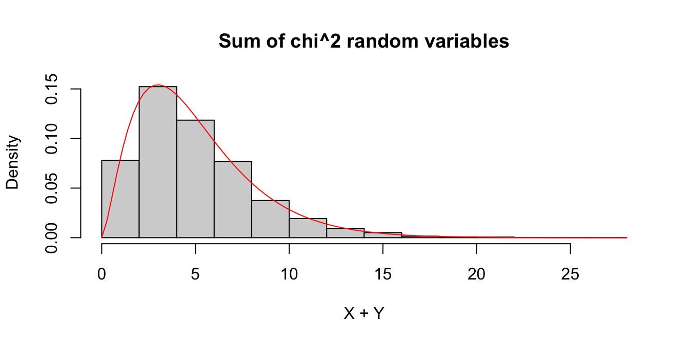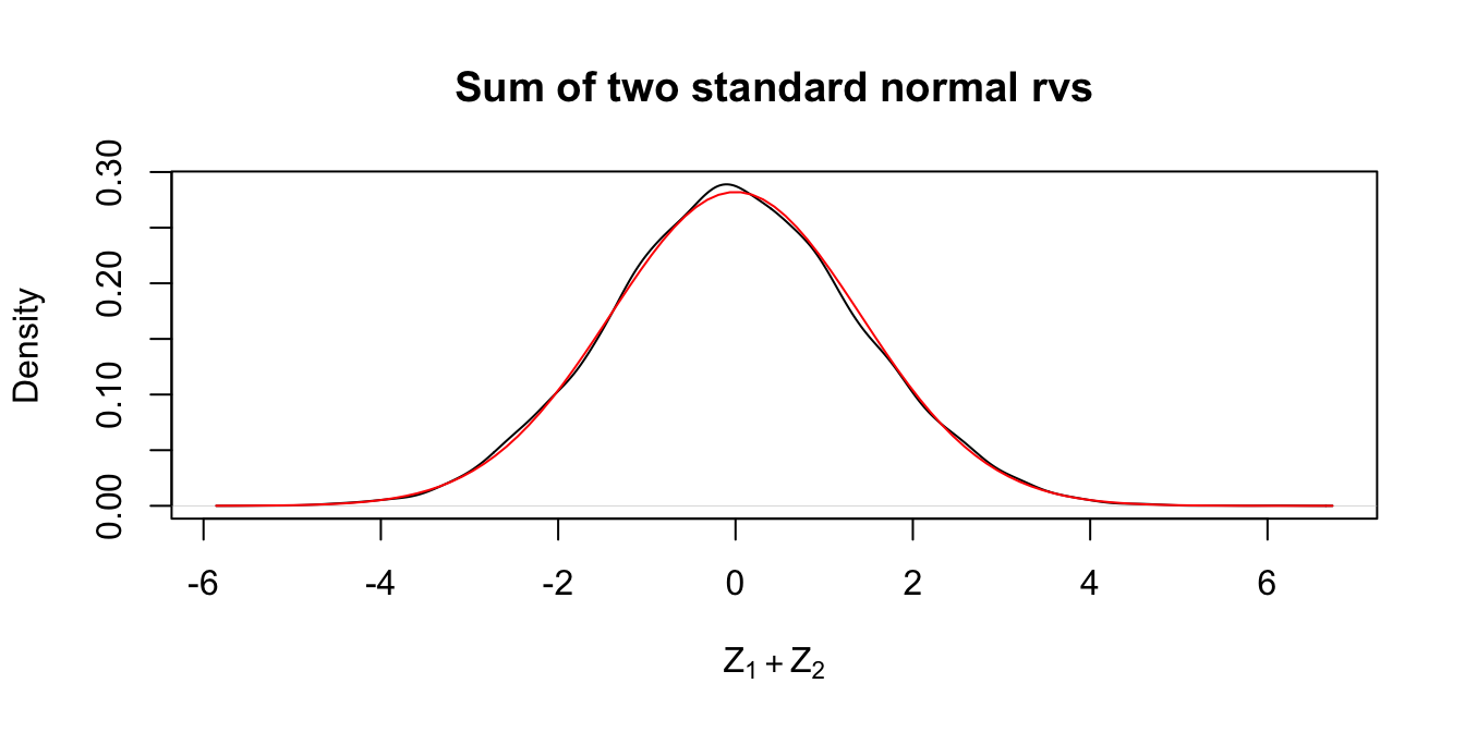 - Simulate the distribution of \(X + Y\) and plot it. Add a normal pdf to your plot with mean and standard deviation to match the density of \(X + Y\).