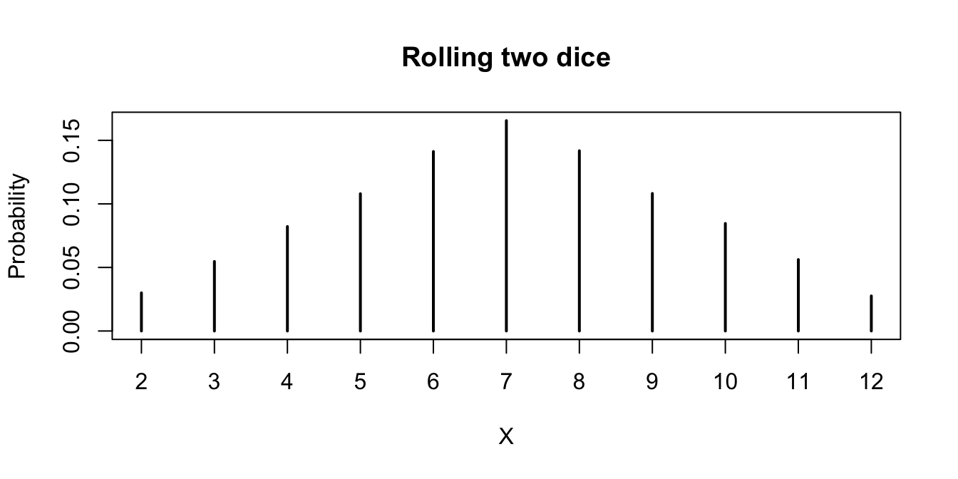 Suppose that two dice are rolled, and their sum is denoted as \(X\). Estimate the pmf of \(X\) via simulation.