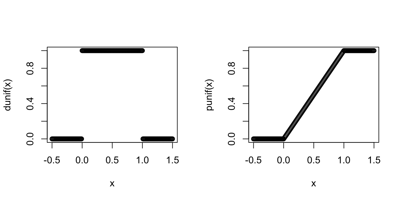 The pdf and cdf of the uniform random variable \(X\) are implemented in R with the functions dunif